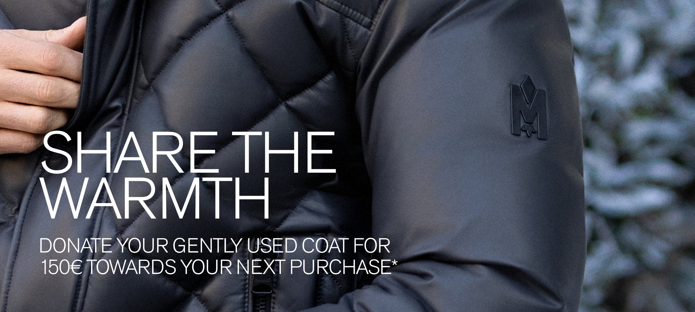 * DONATE A GENTLY WORN COAT BETWEEN OCTOBER 1, 2025, AND OCTOBER 31, 2025, TO RECEIVE €150 OFF A VALID PURCHASE OF €1000 OR MORE BEFORE TAXES. OFFER IS VALID IN PARTICIPATING MACKAGE STORES AND ONLINE AT MACKAGE.COM, MACKAGE.CA, OR MACKAGE.EU FROM OCTOBER 1, 2025, THROUGH DECEMBER 31, 2025. ONE OFFER PER CUSTOMER. OFFER CANNOT BE TRANSFERRED TO ANOTHER PERSON, APPLIED TO PREVIOUS PURCHASES, USED TOWARD THE PURCHASE OF GIFT CARDS, REDEEMED FOR CASH, OR COMBINED WITH ANY OTHER OFFER. TO REDEEM IN STORE, PRESENT THIS EMAIL AT THE REGISTER. TO REDEEM ONLINE, ENTER YOUR UNIQUE CODE AT CHECKOUT. ALL ITEMS ARE FINAL SALE AND CANNOT BE RETURNED OR EXCHANGED. TERMS OF OFFER ARE SUBJECT TO CHANGE.