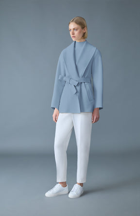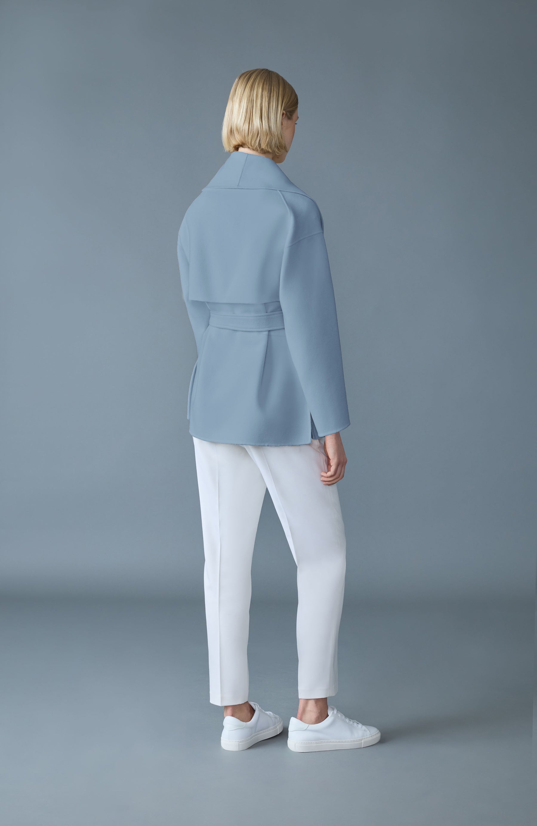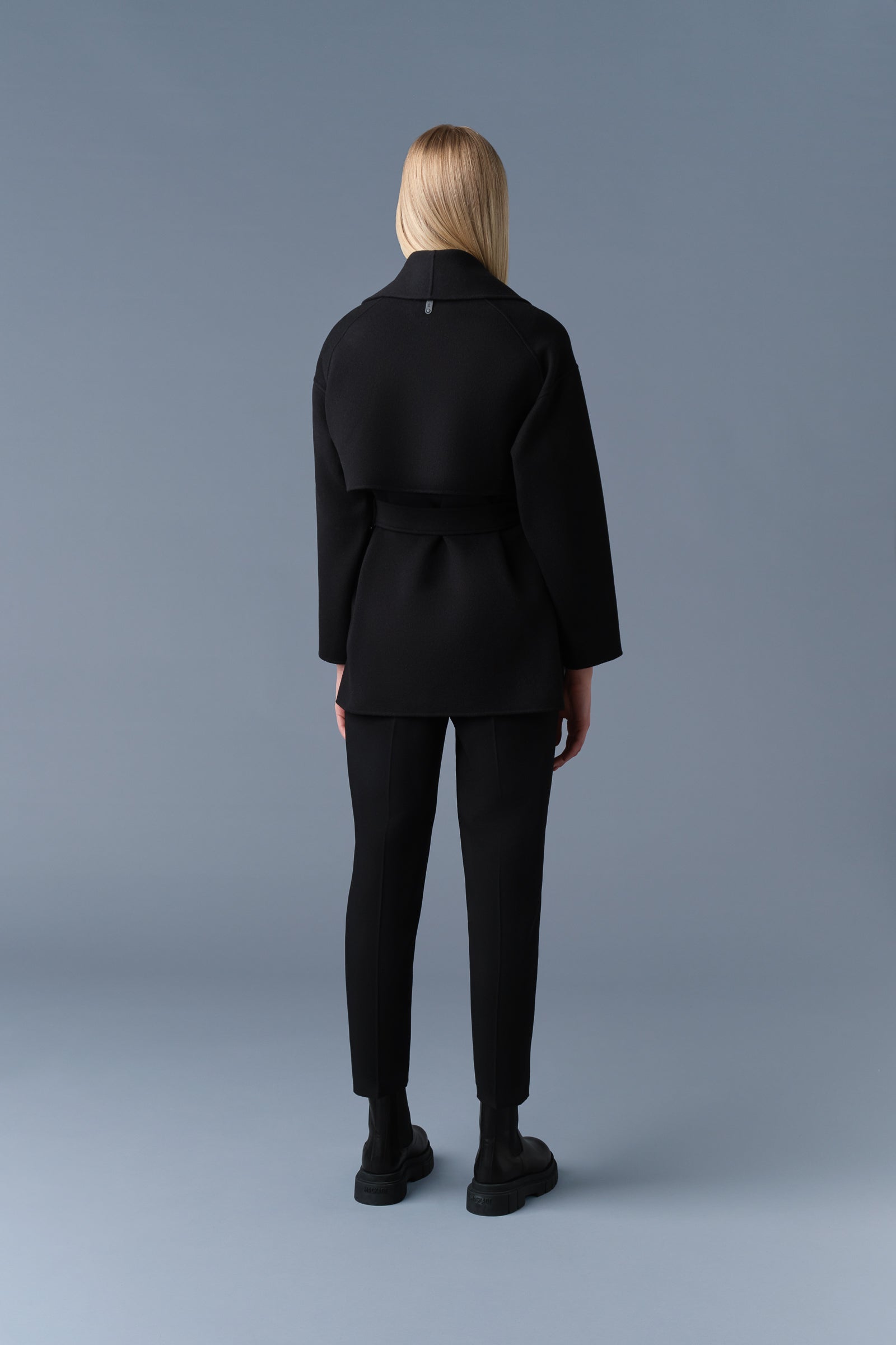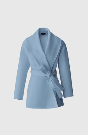 TYRA is a double-face wool wrap jacket with a robe silhouette and shawl collar. Expertly handmade and tailored to a relaxed fit, a sustainable leather and wool sash belt details the drop shoulder tie-front style. Ultra soft and unlined for a fluid drape. Modern and chic, a new classic to pair with everything.