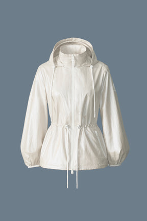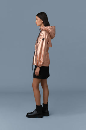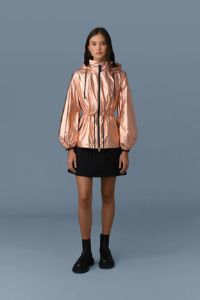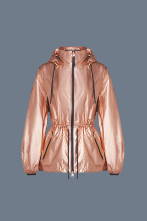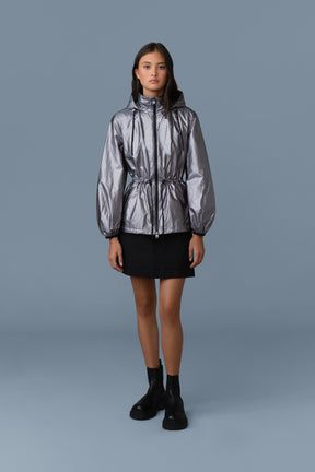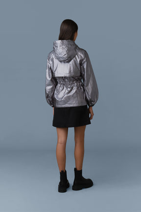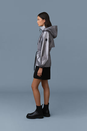 ISHA is a 2-layer rain jacket with a metallic laminate finish. It features water-resistant zippers, back rain shedder, and a secure two-way zippered top closure. Windproof exterior and adjustable storm visor add to its utilitarian style. Relaxed fit with balloon sleeves for a modern tailored style. Performance-driven with a standout style.