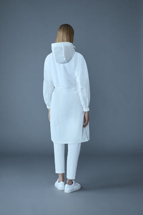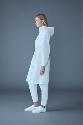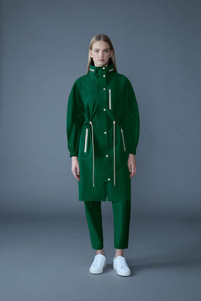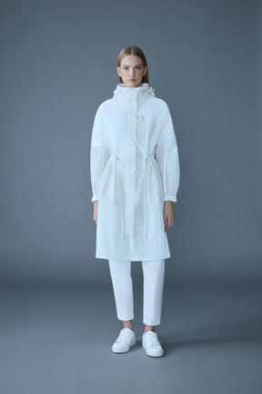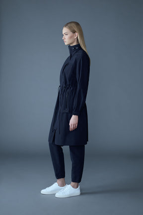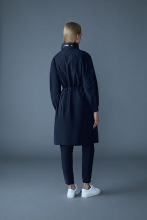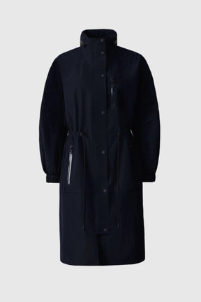 MAKAYLA is a lightweight ripstop, knee-length rain jacket crafted from recycled materials for sustainable style. Featuring a hidden hood inside the collar, water-resistant zippers, and a streamlined front placket with snaps for water-repellent coverage. An adjustable drawcord waist and elasticized cuffs enhance fit and comfort, while dual patch pockets provide practical functionality. Finished with tonal MACKAGE embroidery along the placket for an understated branded touch.