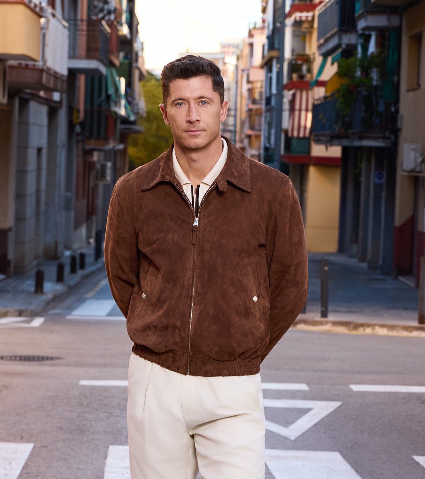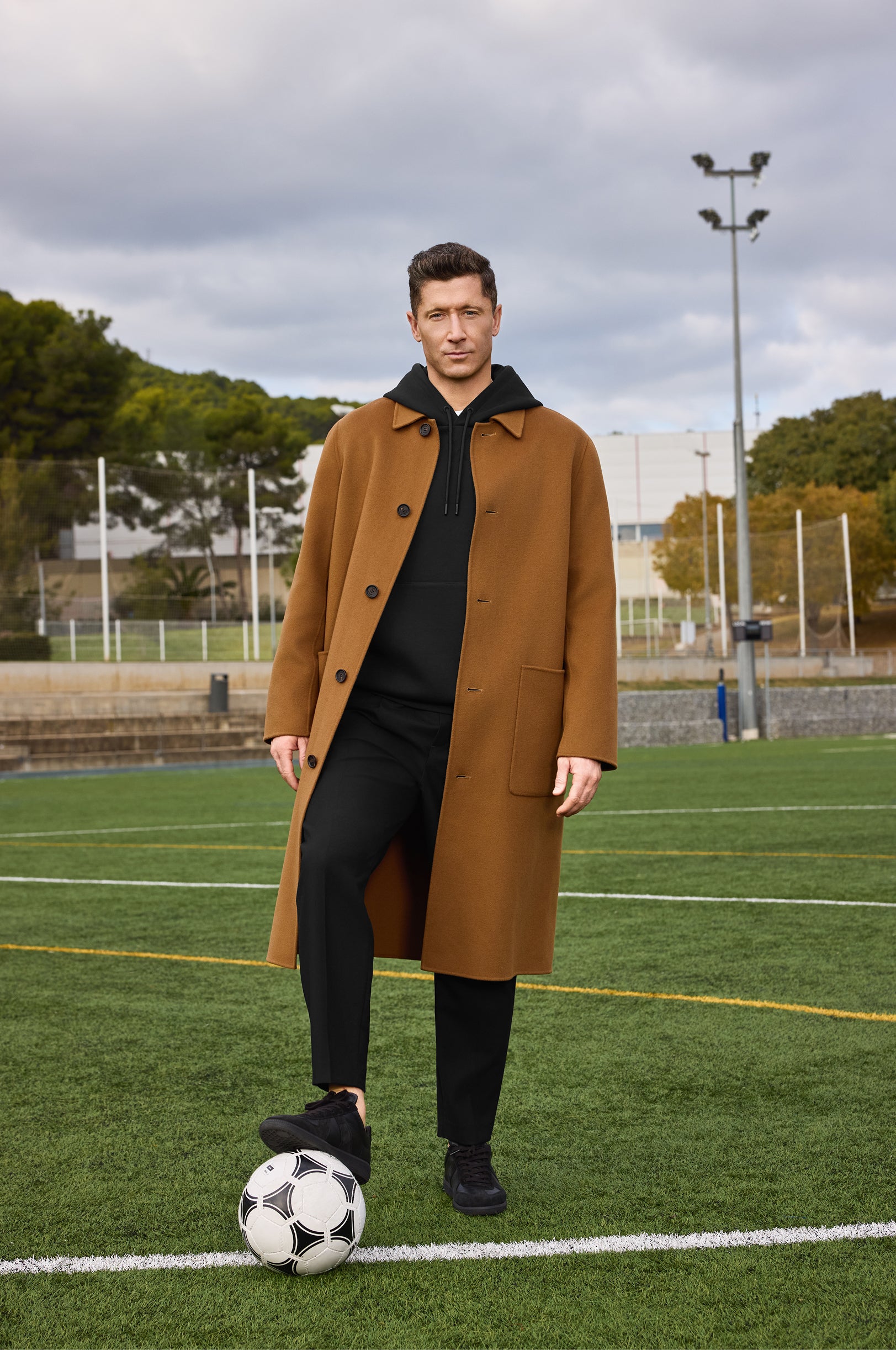 Nous déambulons avec Lewandowski dans des rues en pavés historiques jusqu’au terrain de son équipe, alors qu’il porte des articles innovateurs de la collection printemps-été 2026 : coquilles au design de pointe, suède raffné et manteaux ultra-légers conçus pour équilibrer intensité et aisance. Des trenchs deux-en-un dans des tissus extensibles haute performance. Des designs de confection hybride mariant notre nouveau suède à un tissu matelassé en nylon recyclé. Des blousons d’aviateur à panneau confort au dos, pour une parfaite liberté de mouvement. Des détails techniques comme l’isolant PrimaLoft® Silver et des systèmes d’aération; une confection ciblant la performance longue durée. « Des designs qui définissent non seulement notre look, mais aussi la façon dont on vie et on performe », comme le décrit Lewandowski.